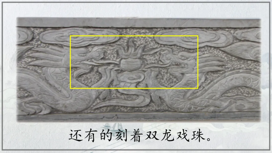 这些都是“龙”的图案,我们一起来看看这些精美的图案吧。你看,桥面两侧有石栏,栏板上雕刻着精美的图案。看着这些图片,你有什么想说的?