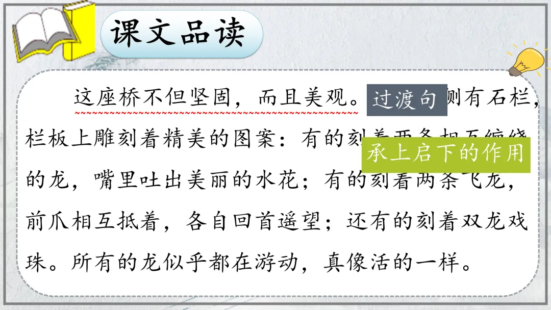 3.课文的第二自然段写了赵州桥的“坚固”,而第三自然段写了桥的“美观”。文中哪句话把“坚固”和“美观”两个内容连接起来?请大家用波浪线把它划下来。我们来认识过渡句,谁知道这个句子在这里起到怎样的作用?