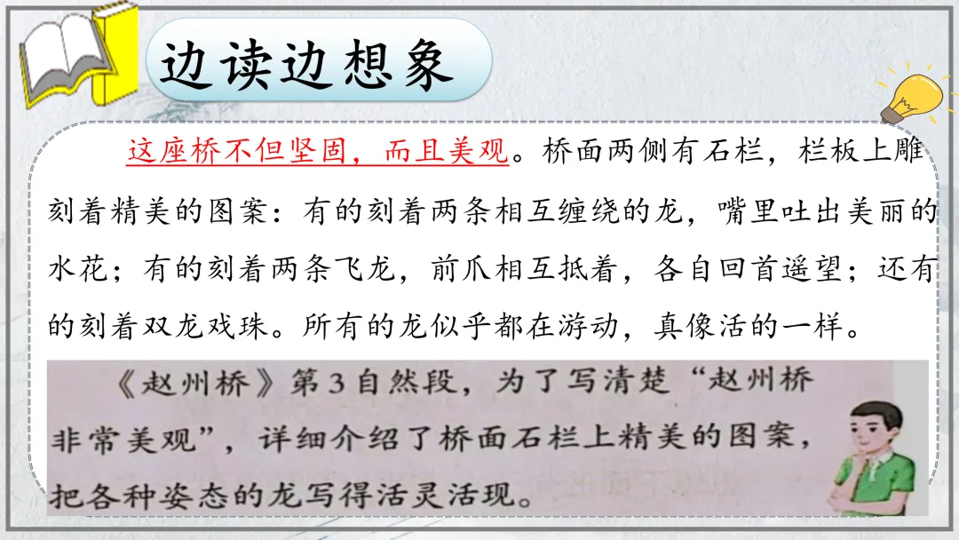 4.《赵州桥》第3自然段,为了写清楚“赵州桥非常美观”,详细介绍了桥面石栏上精美的图案,把各种姿态的龙写得活灵活现。让我们一起来读读第三自然段。