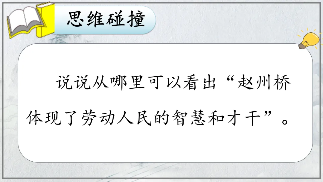 1.课文学到这,谁能说说从哪里可以看出“赵州桥体现了劳动人民的智慧和才干”?