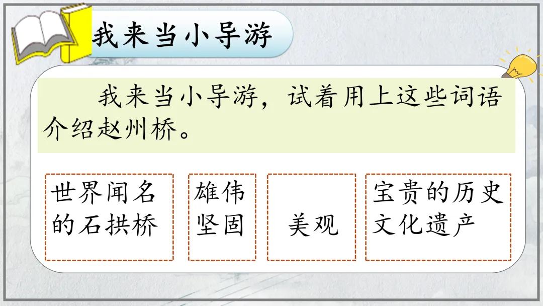 这次,咱们换个身份,你变成了一名导游,要给游客介绍赵州桥,你会怎么说?