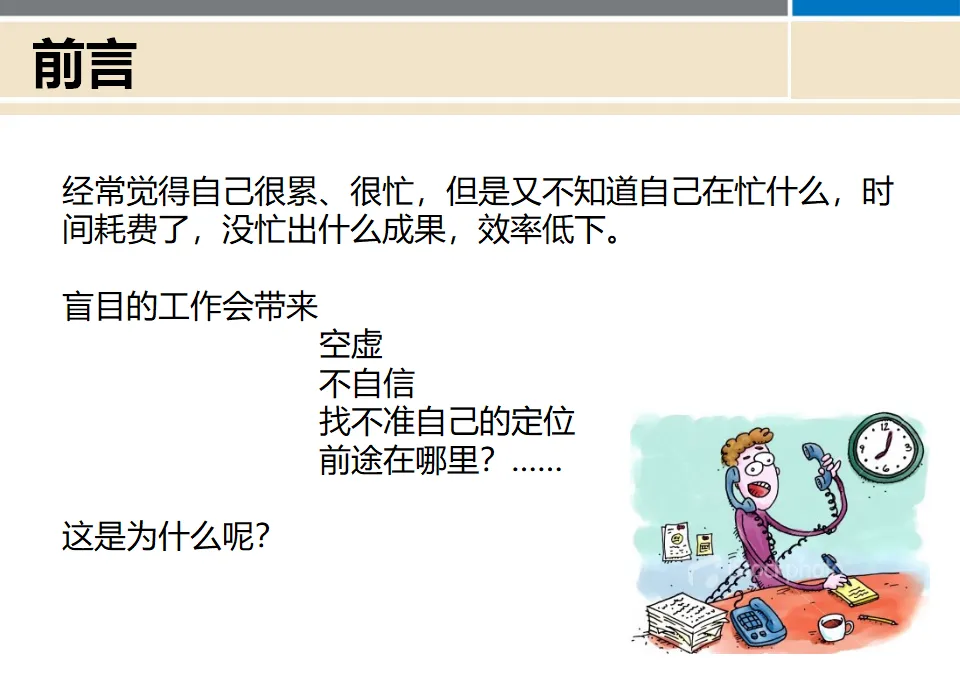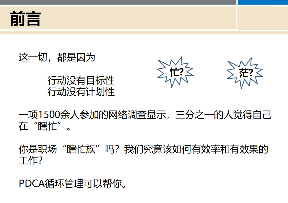 有一项网络调查显示,在1500余名参与者中,有三分之一的人觉得自己在"瞎忙"。这意味着,每三个人中就有一个人在无效忙碌。各位,你们想一想,自己是不是那个"瞎忙族"中的一员?