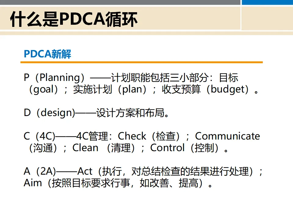 随着管理实践的发展,人们对PDCA有了新的理解和诠释: