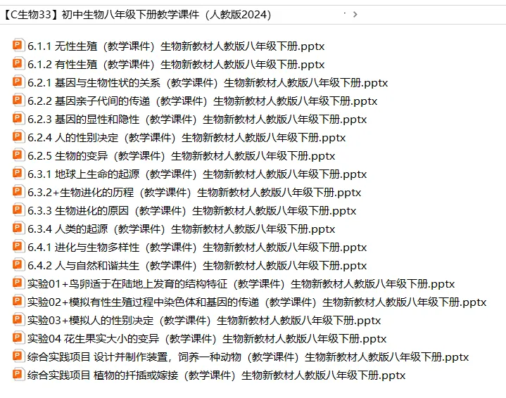 今天小新给同学们整理了初中生物——八年级下册教学课件(人教版2024)。家有初中生的家长可以给孩子打印一份。