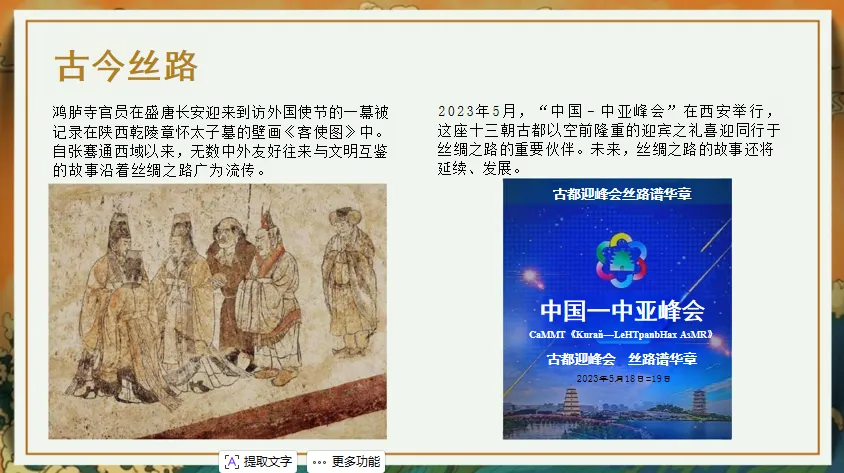 以2023年中国-中亚峰会在西安举办的盛况切入:“古都西安曾是丝路起点,如今再次以迎宾之礼联结丝路伙伴。而千年前,陕西乾陵章怀太子墓的《客使图》,早已定格了鸿胪寺官员迎接外国使节的画面。”展示《客使图》与峰会迎宾图对比,提问:“从古代使节相望到今日峰会相聚,丝绸之路从未中断文明的对话。这条路上,无数文物见证了中外美术的碰撞与融合,它们藏着怎样的美学密码?”自然引出课题《领略丝路遗珍-—丝路美术中的文明互鉴》