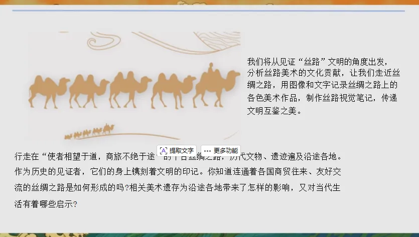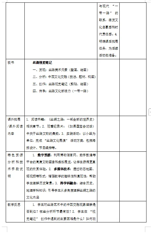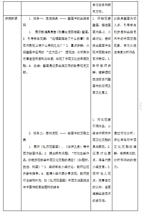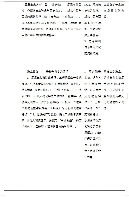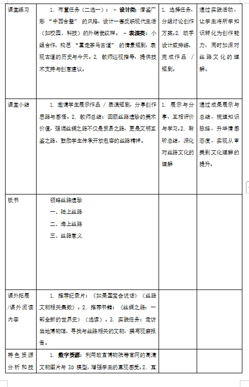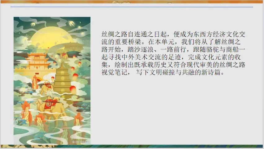 3. 文化理解:理解丝绸之路作为东西方文明交流桥梁的意义,体会美术作品中文化互鉴的价值,树立文化自信与开放包容的审美态度。