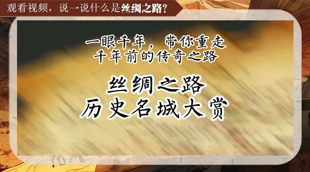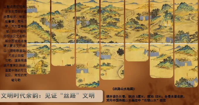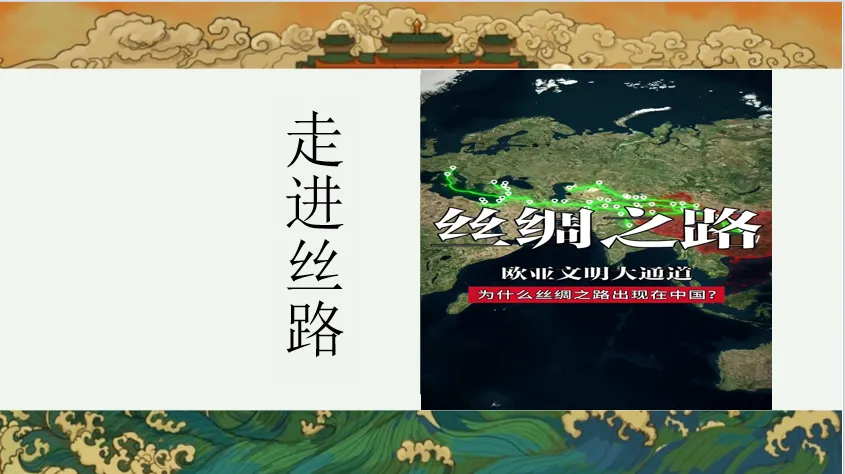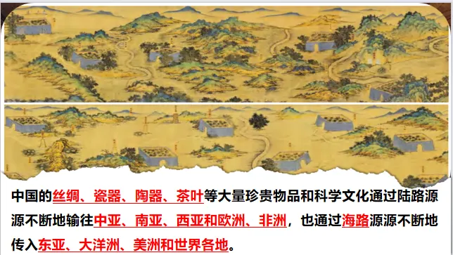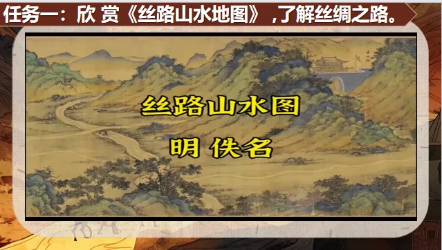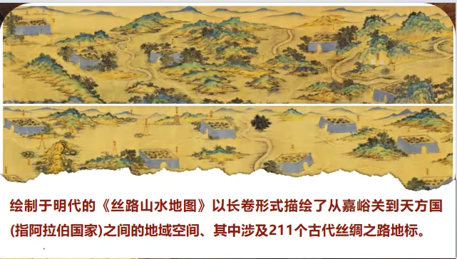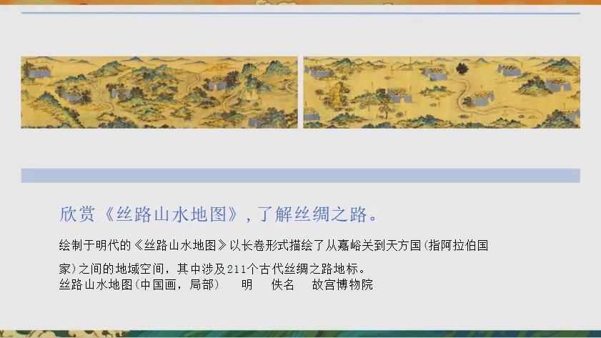 展示明代《丝路山水地图》局部,介绍:“这幅长卷描绘了从嘉峪关到天方国的211个丝路地标,见证了使者相望于道,商旅不绝于途的盛景。”补充丝绸之路的定义:“广义上包括陆上与海上丝路,是古代中国向亚非欧输送丝绸、陶瓷等物品的文化经济通道。引导学生初步感知丝路的地理范围与历史意义。