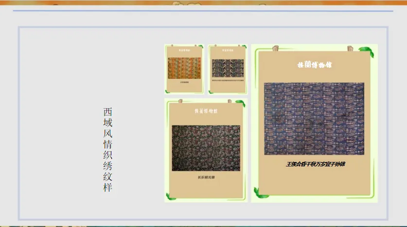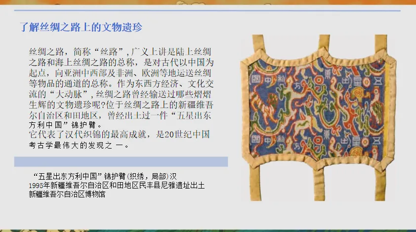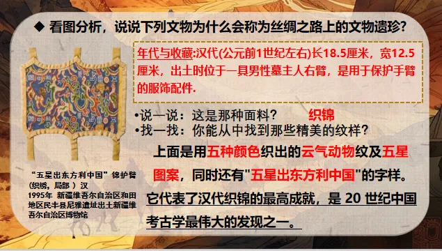1.展示“五星出东方利中国”锦护臂、红地龟背团龙凤纹披肩等织绣文物,对比中原与西域织绣纹样:“中原纹样多龙凤、云纹,寓意吉祥;西域纹样以几何纹为主,风格奔放,它们如何在一件文物中共存?”