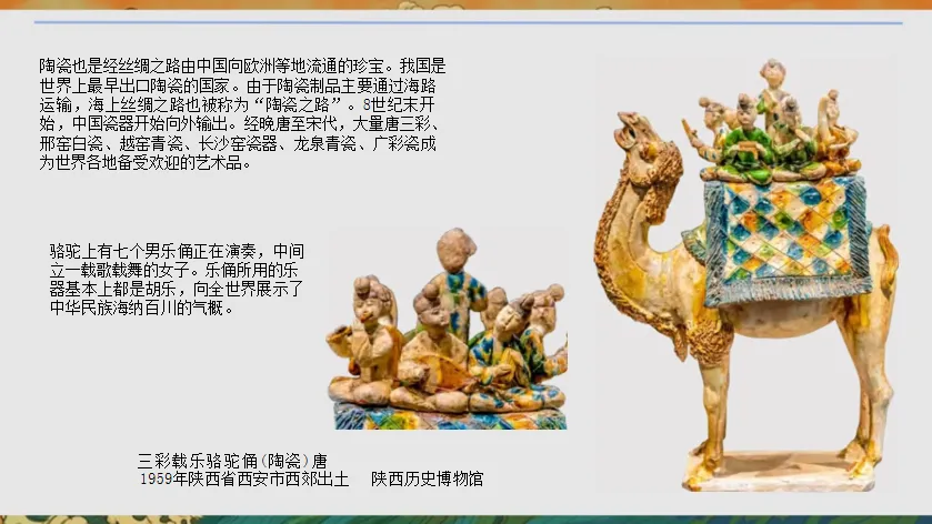 2. 聚焦陶瓷文物,展示三彩载乐骆驼俑、三彩凤首壶、广彩瓷:“骆驼俑的胡乐乐器、凤首壶的波斯造型、广彩瓷的中西绘画技法,分别对应哪些异域文化?引导学生完成“文物元素分类表”(简笔记录中原与异域元素)。