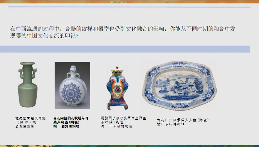 2. 补充案例:“三彩凤首壶将波斯萨珊式造型与中国传统陶瓷工艺结合,广彩瓷延续中国笔法又借鉴西方技巧,这些融合让艺术更具多元性。”教师总结融合的价值。