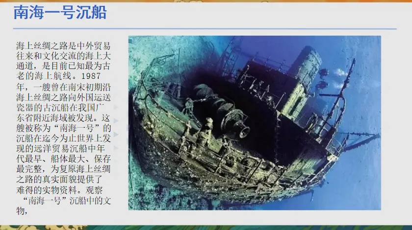 1.组织小组讨论:“丝路上的美术作品为何会出现中外元素融合?这种融合对美术发展有何意义?”结合“南海一号”沉船文物,分析商贸往来对文化融合的推动作用。