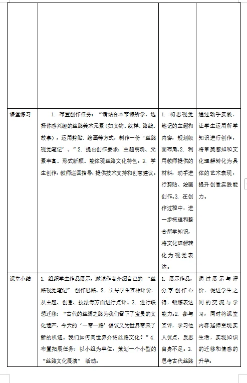 环节小结:通过作品展示与互评,我们进一步明确了创意设计的优化方向,同时深刻体会到丝路精神的当代价值——文化互鉴是美术创新的重要源泉,也是文化传承的核心路径。