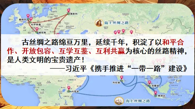 【板书:】丝路陆上+海上文明桥梁古今延续