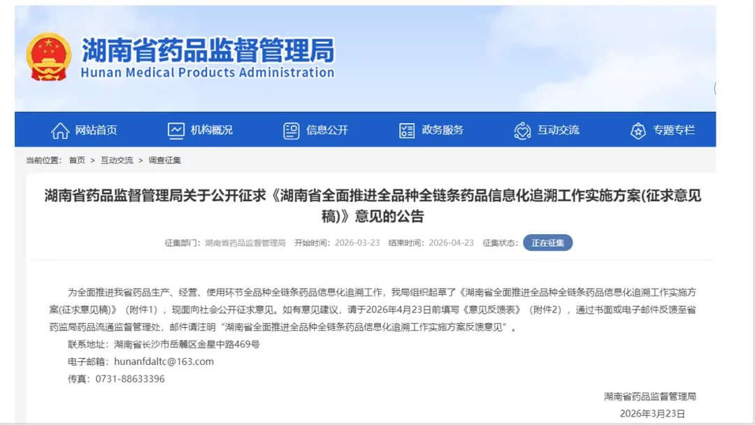 湖南:药品追溯再度升级,征求“三全”(全面推进、全品种、全链条)工作实施方案意见,扫码上传率达100%