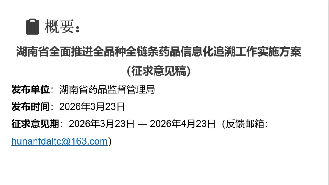 近日,湖南省药监局下发《湖南省全面推进全品种全链条药品信息化追溯工作实施方案(征求意见稿)》,本文依据征求意见整理,供大家学习参考,