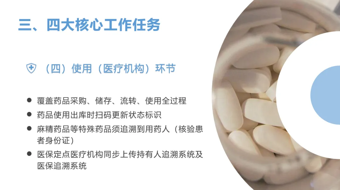 实现药品生产、经营、使用环节全品种全链条追溯,确保药品来源可查、去向可追、责任可究。