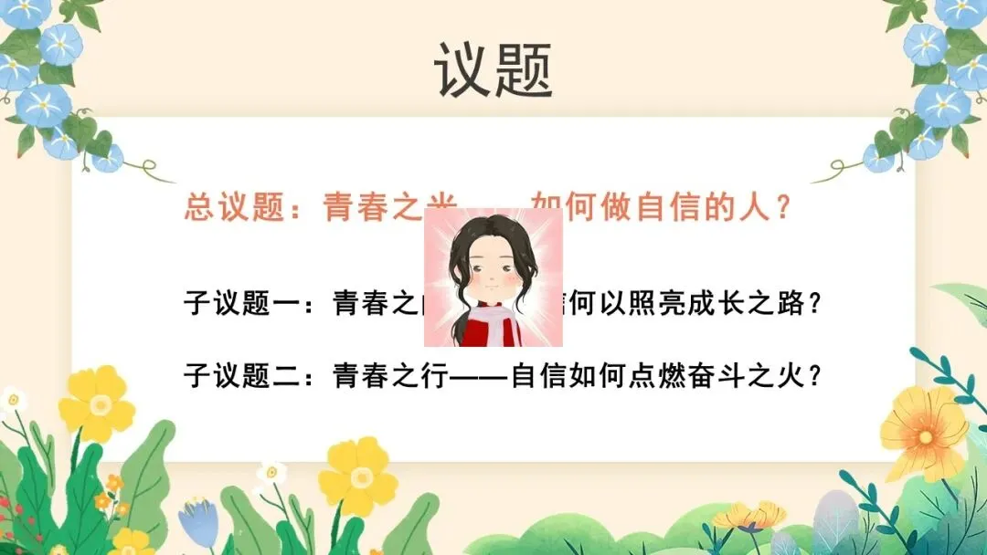 (一)导入新课。展示“学生自信瞬间”图片(自信领奖、唱歌、发言),提问:你是一个自信的人吗?从而引出课题:青春需要自信,今天一起学习《做自信的人》。(二)讲授新课。子议题一:青春之问 —— 自信何以照亮成长之路?子议题二:青春之行 —— 自信如何点燃奋斗之火?