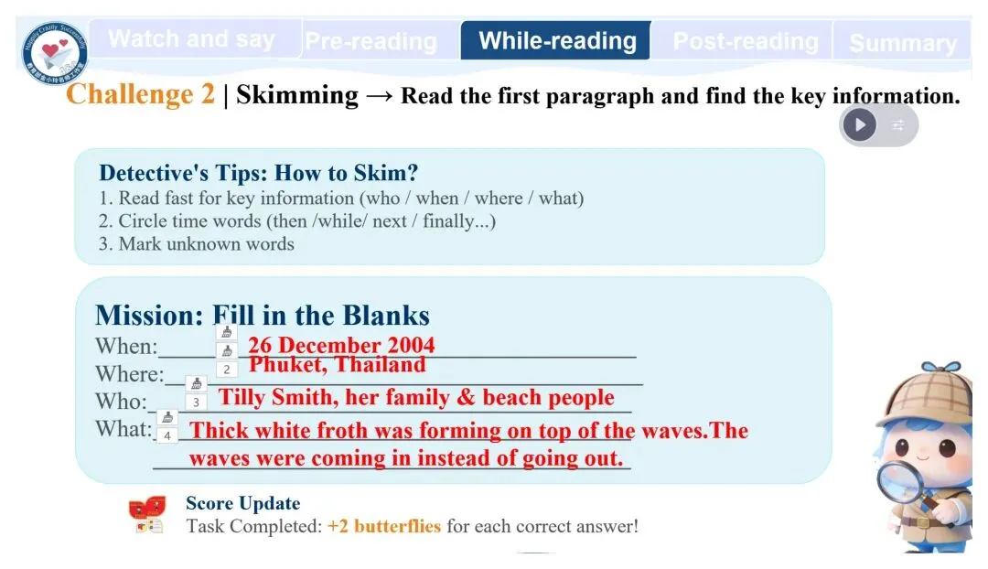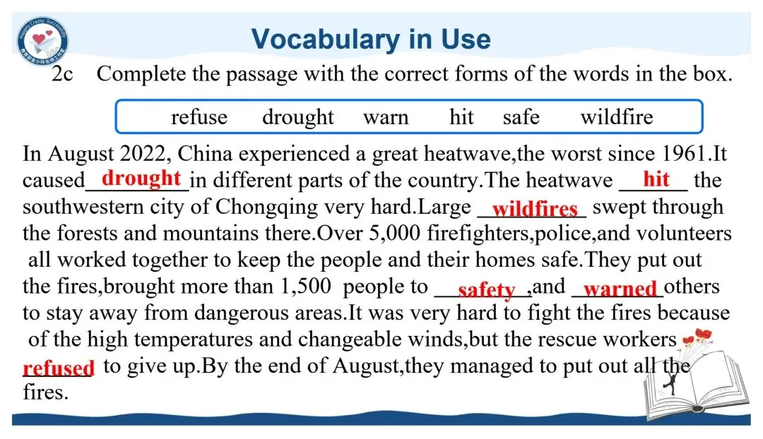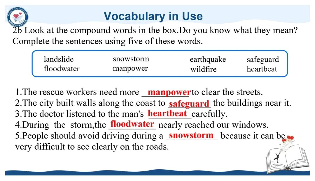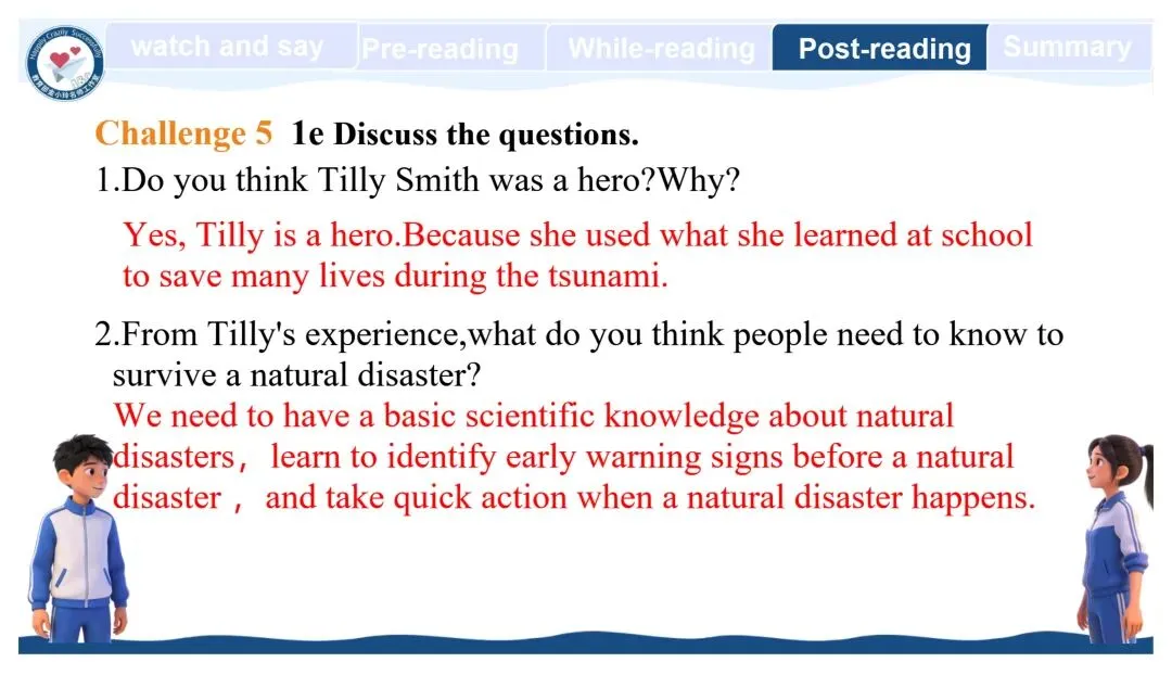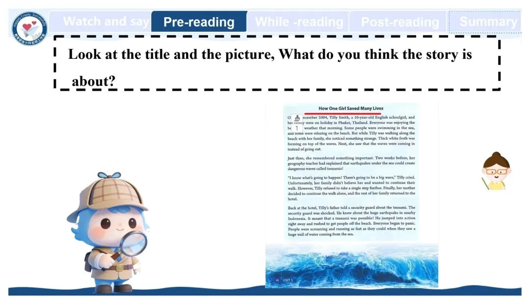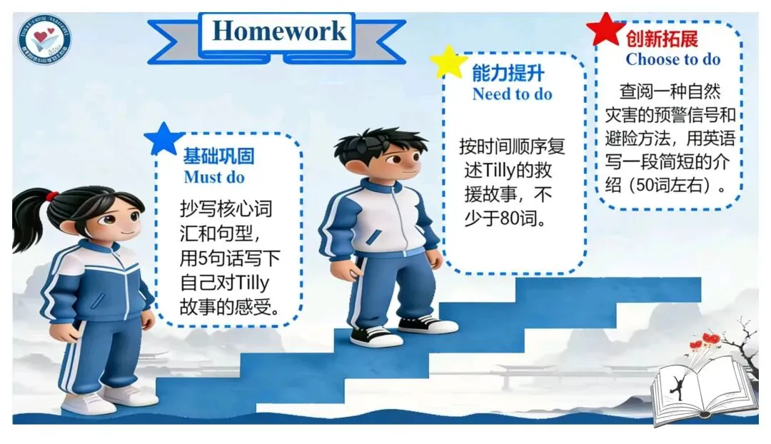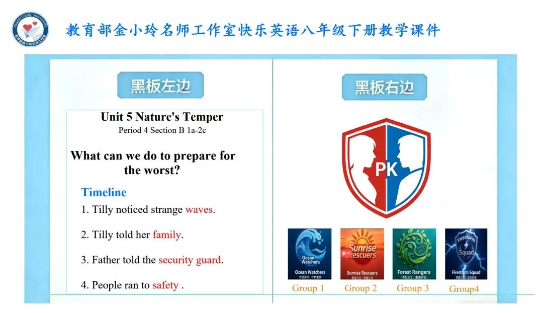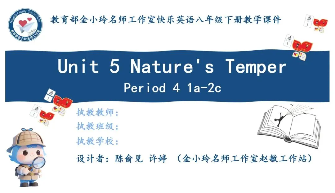 亲爱的老师们: 大家好!欢迎来到教育部金小玲快乐英语名师工作室公众号,我们为您精心准备了新教材人教版八年级下册英语原创教学资源开发专栏。 我们初中部团队汇聚了正高级教师、特级教师、教研员、工作室主持人、学科带头人、教研组长及一线骨干教师等专业力量,倾力打造与新教材人教版八年级下册配套的系列希沃教学课件与教学设计,相关课件与教学设计将同步上线国家中小学智慧教育平台,供各位老师备课参考。这些资源遵循教学大纲要求,融入丰富的教学活动、互动环节与情景语篇,深度践行新课程标准,采用大单元教学评一体化模式,巧妙运用 AI 技术赋能课堂创新,让 "快乐英语教学" 的理念贯穿教学全程,助力教师快乐地教,学生快乐地学,快乐地出教学成果。 本期推出的优秀教学课件是教育部金小玲名师工作室赵敏工作站陈俞见 许婷老师带来的新教材人教版八年级下册 Unit5 Nature's Temper Period4 Section B 1a-2c希沃教学课件。让我们一同开启这段生动有趣的英语教学新旅程! Unit5 Nature's Temper Period4 Section B 1a-2c Unit 5 Nature's Temper  设计亮点 本系列课件紧扣新课标要求与教材单元主题,以大单元整体教学为统领,深度践行金小玲名师工作室“快乐英语”理念,严格遵循英语学习活动观,将学习理解、应用实践、迁移创新三层次目标梯度贯穿各课时教学全程。课件依托希沃白板互动功能与AI智能技术赋能课堂,创新设计情境探究、任务驱动、小组PK、闯关挑战等多元趣味运动,搭配分层学习支架,兼顾城乡学情与不同能力水平学生,凸显学生主体地位;同步嵌入自评、互评、师评相结合的多元分层评价体系,以星级量表、即时反馈、荣誉激励实现“教学评一体化”,扎实落地语言能力、文化意识、思维品质、学习能力四大核心素养。同时深挖中国文化内涵、融入跨文化对比内容,在语言教学中渗透价值引领,让课件兼具趣味性、实用性、素养性与规范性,既助力教师高效备课、快乐教学,也让学生在乐学善学中提升英语综合运用能力。 作者简介 陈俞见:中学一级教师,湖南省慈利县一鸣中学英语教师、班主任,湖南省慈利县中小学英语名师工作室成员,慈利县七年级下册英语资源优化负责人。 教学实绩突出,所带班级英语成绩稳居前列;教研能力扎实,多篇教学论文在省、市级评比中获奖,作为核心成员参与课题研究并顺利结题。 班级管理成效显著,每学期获评“优秀班主任”;多次参与各级教学比武,表现优异并获嘉奖。 专业提升积极主动,先后参加北京外国语大学“歆语工程”、县级“种子教师”等高层次培训,深度参与县中小学名师工作室资源开发工作,坚守育人初心,赋能区域英语教学。 许婷:深耕初中英语教学,获湖南省集体备课大赛特等奖,省级优课、曾任省级“国培计划”“送培到县”学科专家团队成员,教学与教研能力突出。 撰稿:陈俞见 许婷 编辑:黄荣 初审:赵敏 代文雅 段艳 二审:黄荣 终审:金小玲 |