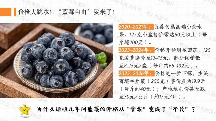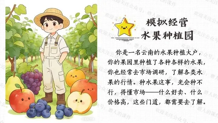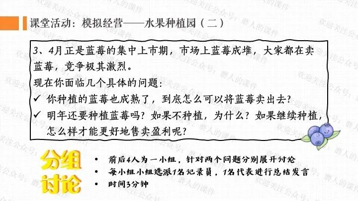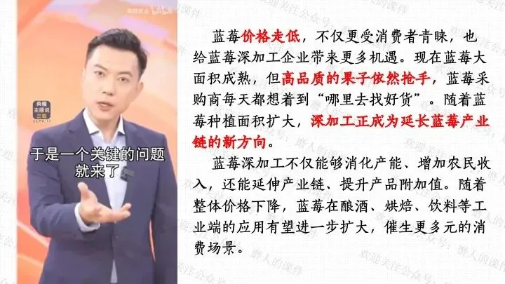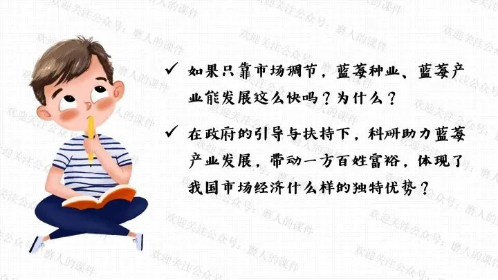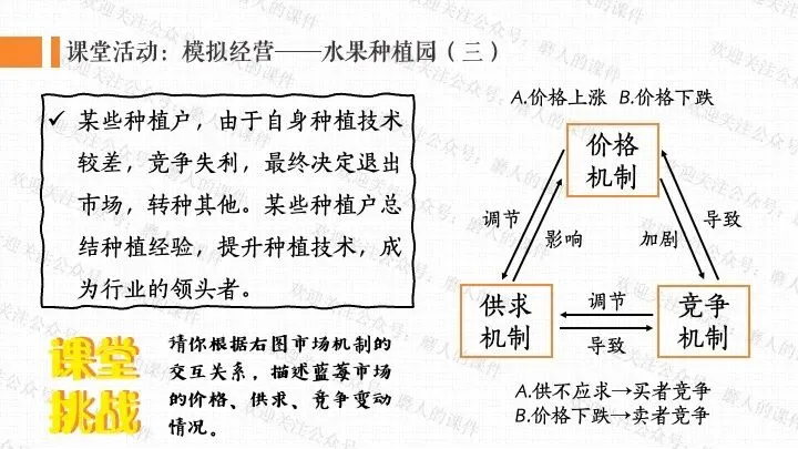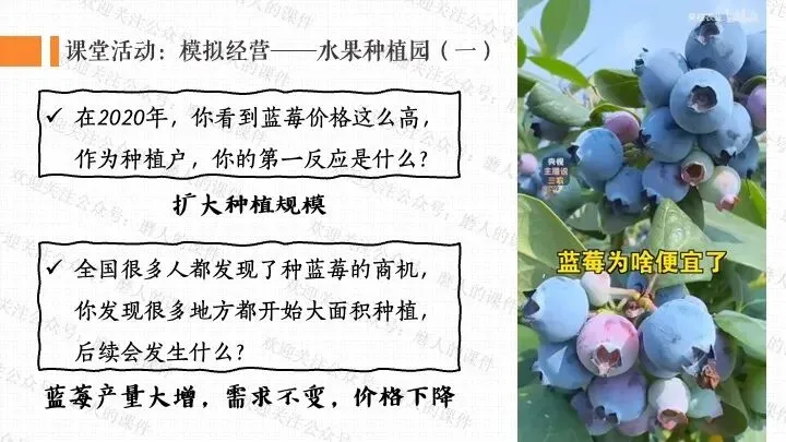 本课以蓝莓价格变迁的生活提问导入,激发学生探究兴趣;通过蓝莓价格 “贵族变平民”、云南石林蓝莓产业崛起等真实案例,梳理社会主义市场经济体制的运行逻辑;以水果种植园模拟经营、市场机制互动探究为依托,设计系列课堂活动,辅以递进式探究问题,生动展现社会主义市场经济的特点优势;通过分析市场失灵与政府监管实践,深刻揭示正确处理政府与市场关系、完善社会主义市场经济体制对于推动高质量发展、实现共同富裕的重大意义。课件逻辑清晰、案例鲜活接地气,有效提升学生经济思维与实践能力。