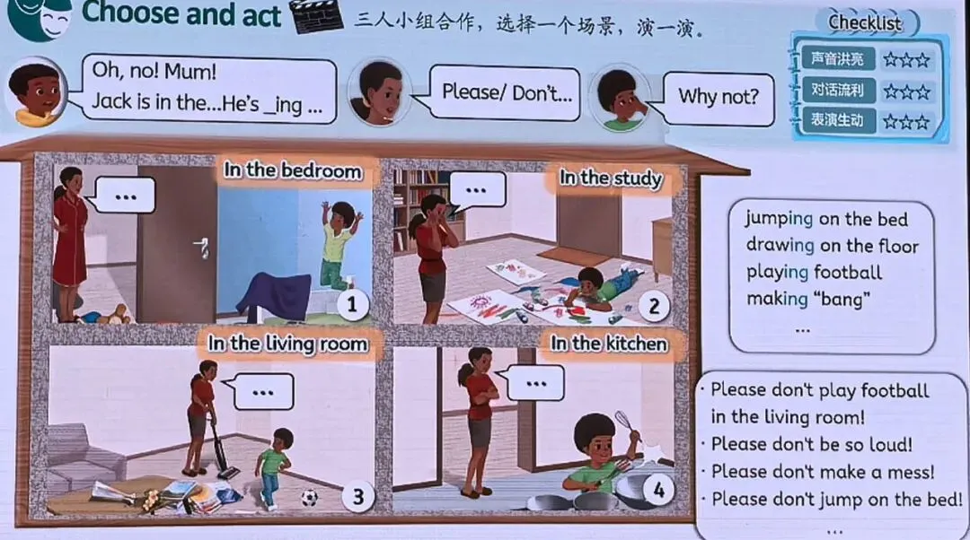 一个人能跑能跳可以说明他的腿脚功能基本正常,但是并不等于他的其他指标没有问题。这两句话,既是真理,也是为凌哥接下来的课件剖析打预防针。这样的课件剖析,并不是否认课件中的优点,也不是否认教学环节的合理性,更不是否定授课教师(及其团队)的努力,而是为了老师们都能多关注课件中的规范性和逻辑性。当然,如果您从来没有想到过这些问题的话,凌哥更会感到欣慰——因为帮到了您。让我们从最简单的开始入手吧。在汉语中,省略号是6个点,句号是小圆圈。英语中的省略号是3个点,句号是小圆点(凌哥通常称之为“句点”)。因此,在汉语中,如果省略号后面再用句号,两者是不“打架”的。但是,在英文中,省略号(...)后面再用一个句点(.),老师们常常心中会举棋不定:这个句点到时是加还是不加?在www.thepunctuationguide.com网站中,有专门关于省略号的用法的介绍。在www.stylemanual.gov.au网站中也可以看到类似的。但是两者有一些略微的差异。thepunctuationguide中的3个点之间是有空格的,而stylemanual中和我们常用的写法一样,点与点之间没有空格。1. 省略号前后都需要空格,除非后面是引号、问号、感叹号。2. 如果你看到4个点,则第一个点是前面句子的句号,与前面的单词之间无空格。后面3个点是省略号。一个不完整的单词需要学生补全,不使用省略号,而使用下划线。想一下,要让学生补全一个字母组合,你是用r...d还是r____d?要让学生补全词汇后缀,你是用read...还是read_____?因此,V-ing形式,也应该用____ing来让学生补全。请注意右上角评价框中的“对话流利”。什么情况下,语言输出能流利?熟悉之后,比如多次朗读之后能流利朗读甚至能达到流利背诵。但是这是创编对话的活动啊(尽管有词汇库和句子库的支持),如果要以“流利”为标准,似乎不太合理。想象一下,您是戏剧学院的学生,教授要您和同伴现场创编一个场景对话,你们能达到“流利”吗?更何况,小组中学生语言水平通常有差异,三人“配戏”的时候,较强的学生可以达到流利,但是弱生就很难做到。凌哥的建议是:创编类的活动,不要将“流利度”作为评价标准,而更应该关注其他表达策略。John: Oh, no! Mum! Jack is in the ... He's ...ing ...有没有发现,在这个范例当中,“Please/”是不是在上下文中的是不符合逻辑的?如果使用“Please/”的话,下面的一行是否最好也应该改成“OK. I will. / Why not?”了?What is a "checklist"? Collins学习者词典是这么解释的。A checklist is a list of all the things that you need to do, information that you want to find out, or things that you need to take somewhere, which you make in order to ensure that you do not forget anything.