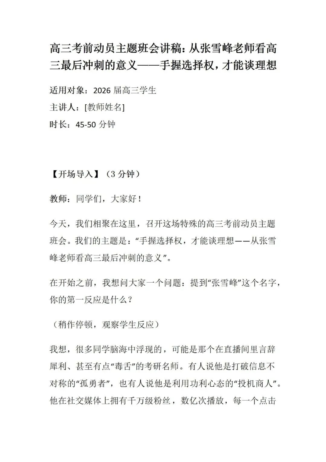 【高三】考前动员主题班会:从张雪峰老师看高三最后冲刺的意义——手握选择权,才能谈理想
