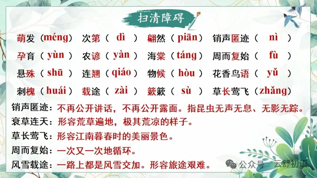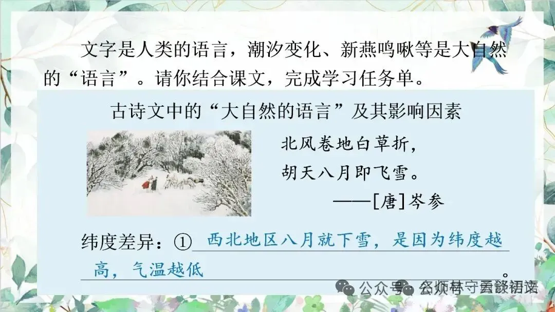 文字是人类的语言,潮汐变化、新燕鸣啾等是大自然的“语言”。请你结合课文,完成学习任务单。