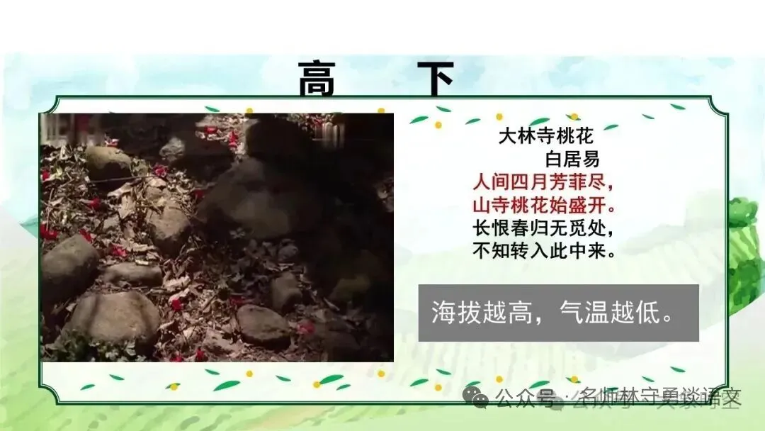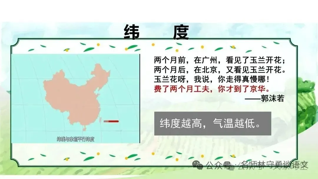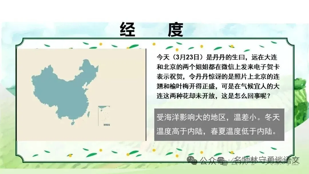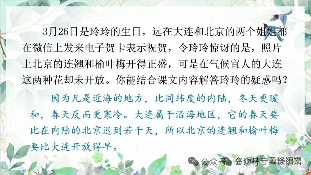 3月26日是玲玲的生日,远在大连和北京的两个姐姐都在微信上发来电子贺卡表示祝贺,令玲玲惊讶的是,照片上北京的连翘和榆叶梅开得正盛,可是在气候宜人的大连这两种花却未开放。你能结合课文内容解答玲玲的疑惑吗?