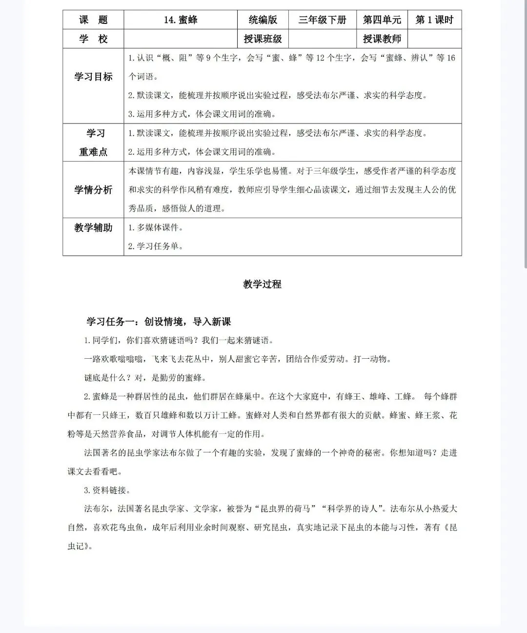 【新课标精品课件】三年级下《4.14蜜蜂》课件+教案+分层作业+学习任务单