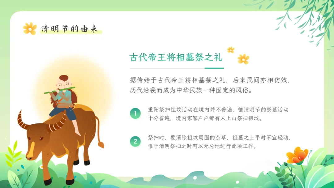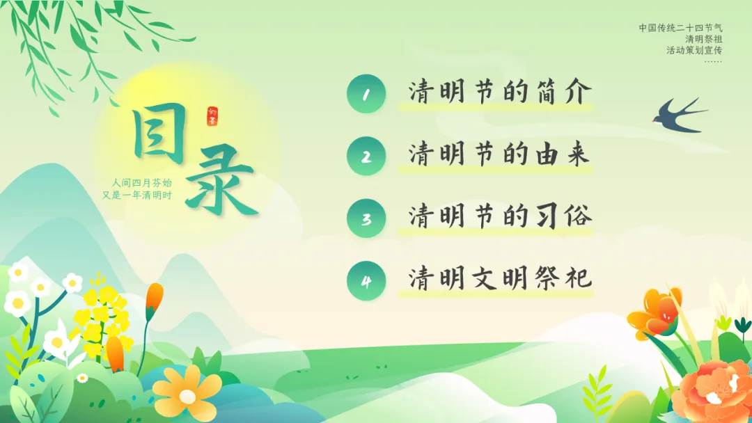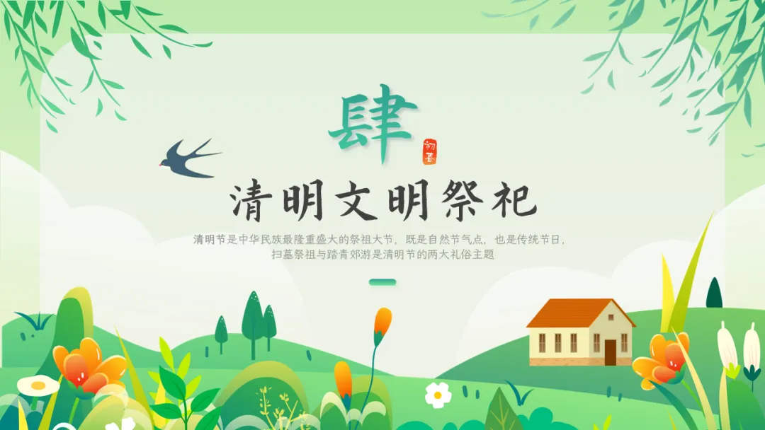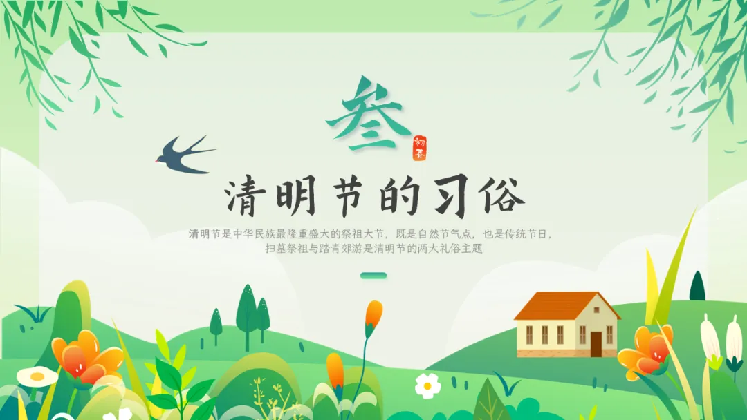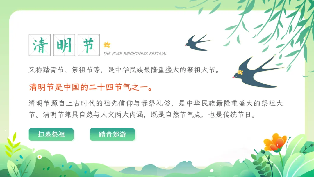 清明节是肃穆追思与蓬勃迎春的有机统一,具有自然节气与人文节日的双重属性,2006年,清明节被列入第一批国家级非物质文化遗产,其文化价值被高度重视,也是中小学传统文化教育的良好契机。本期给大家分享的是清明节文化习俗介绍主题教育ppt课件,人间四月芬始,又是一年清明时。
