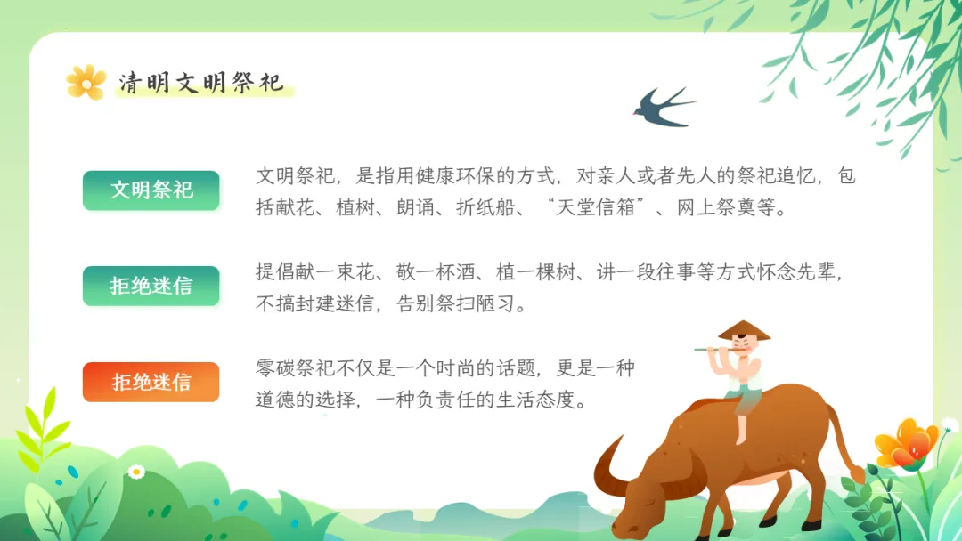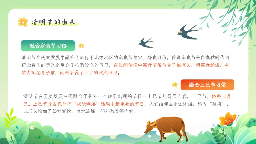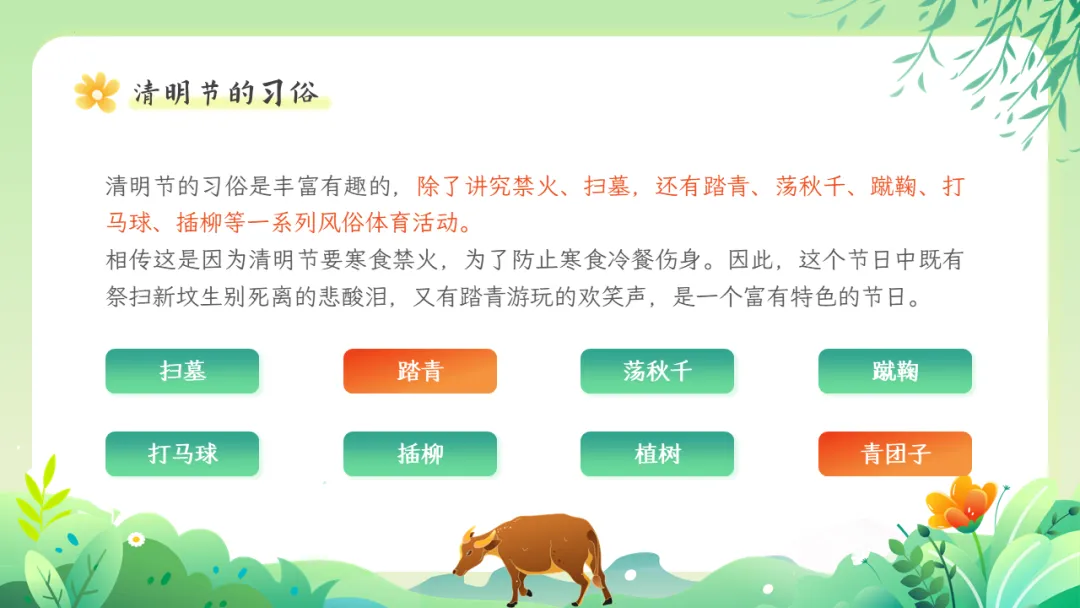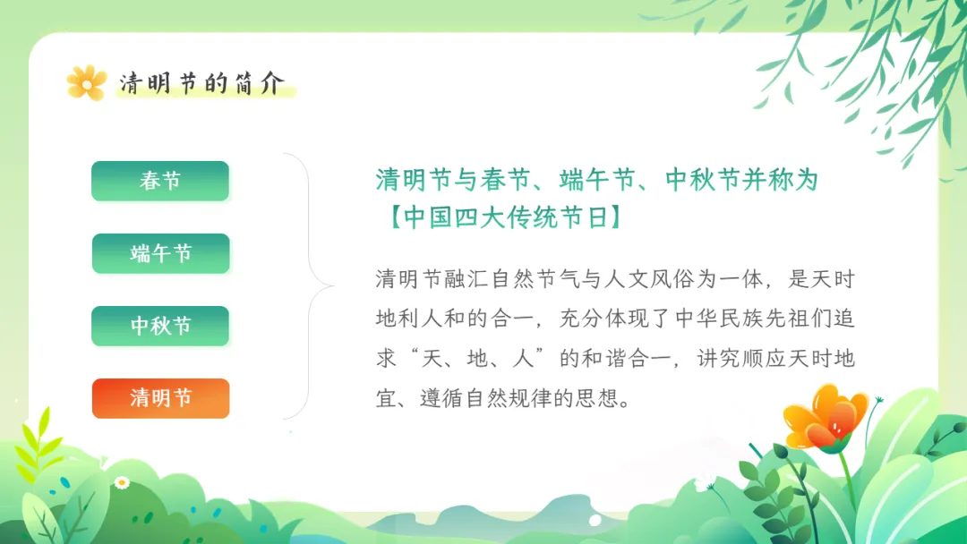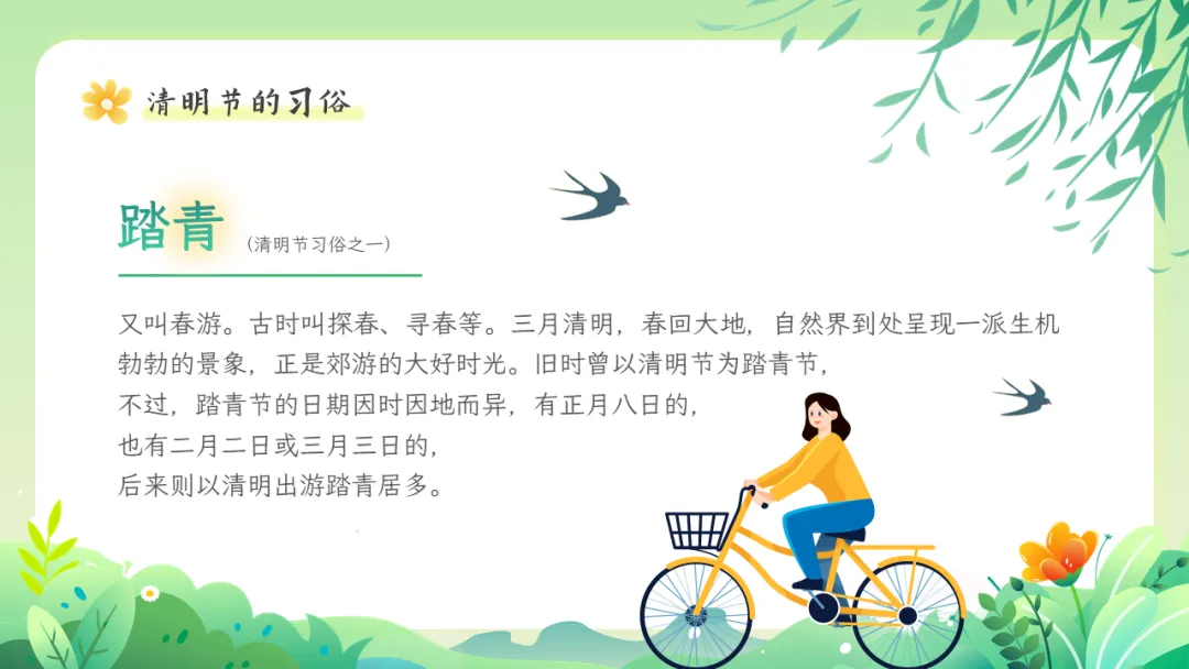 清明节是肃穆追思与蓬勃迎春的有机统一,具有自然节气与人文节日的双重属性,2006年,清明节被列入第一批国家级非物质文化遗产,其文化价值被高度重视,也是中小学传统文化教育的良好契机。本期给大家分享的是清明节文化习俗介绍主题教育ppt课件,人间四月芬始,又是一年清明时。