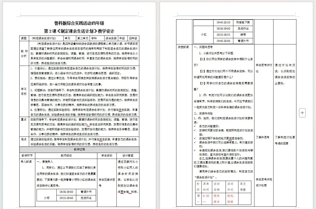1、价值体认:通过实践活动制定适合自己的课余生活计划,培养学生珍惜时间的好习惯,增强自我管理意识。在小组合作讨论交流中,初步形成集体思想,组织观念。