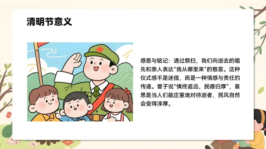 清明节教育的核心,从来不是教会孩子怎么哭,而是教会他们怎么爱。只要我们还记得,他们就永远活在我们的心里,活在这个万物复苏的春天里。