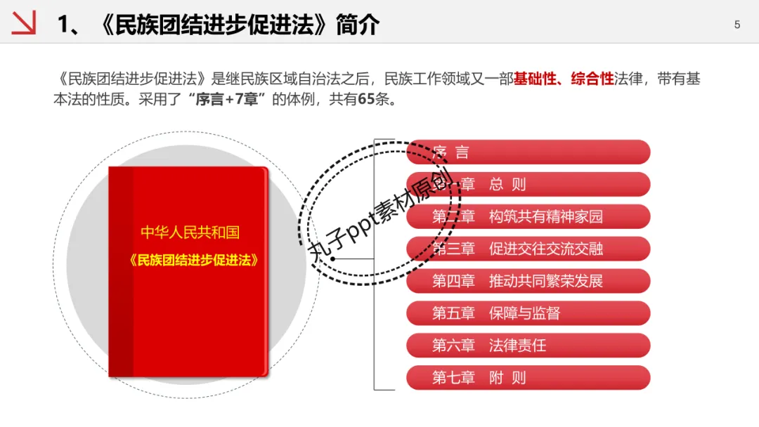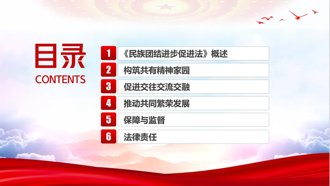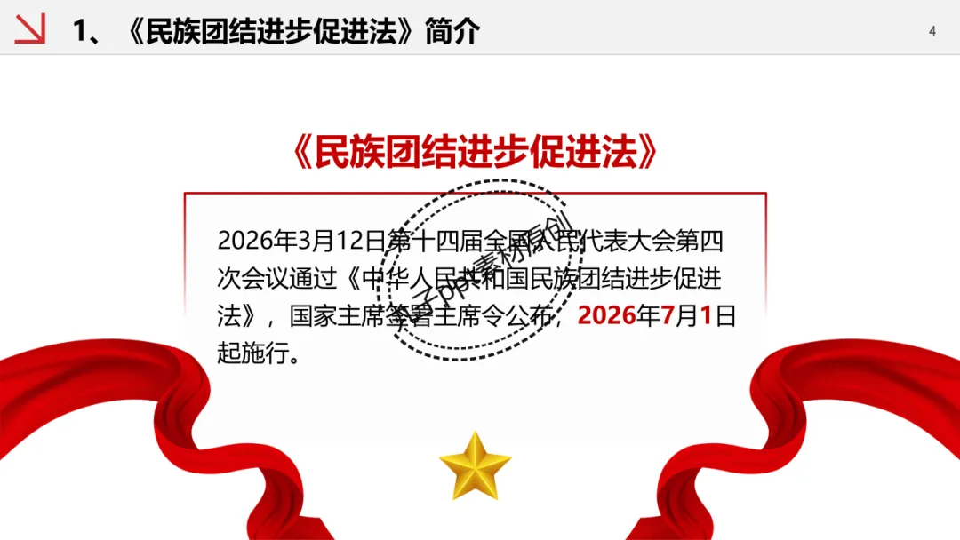 《民族团结进步促进法》是继民族区域自治法之后,民族工作领域又一部基础性、综合性法律,带有基本法的性质。采用了“序言+7章”的体例,共有65条。2026年7月1日起施行。
