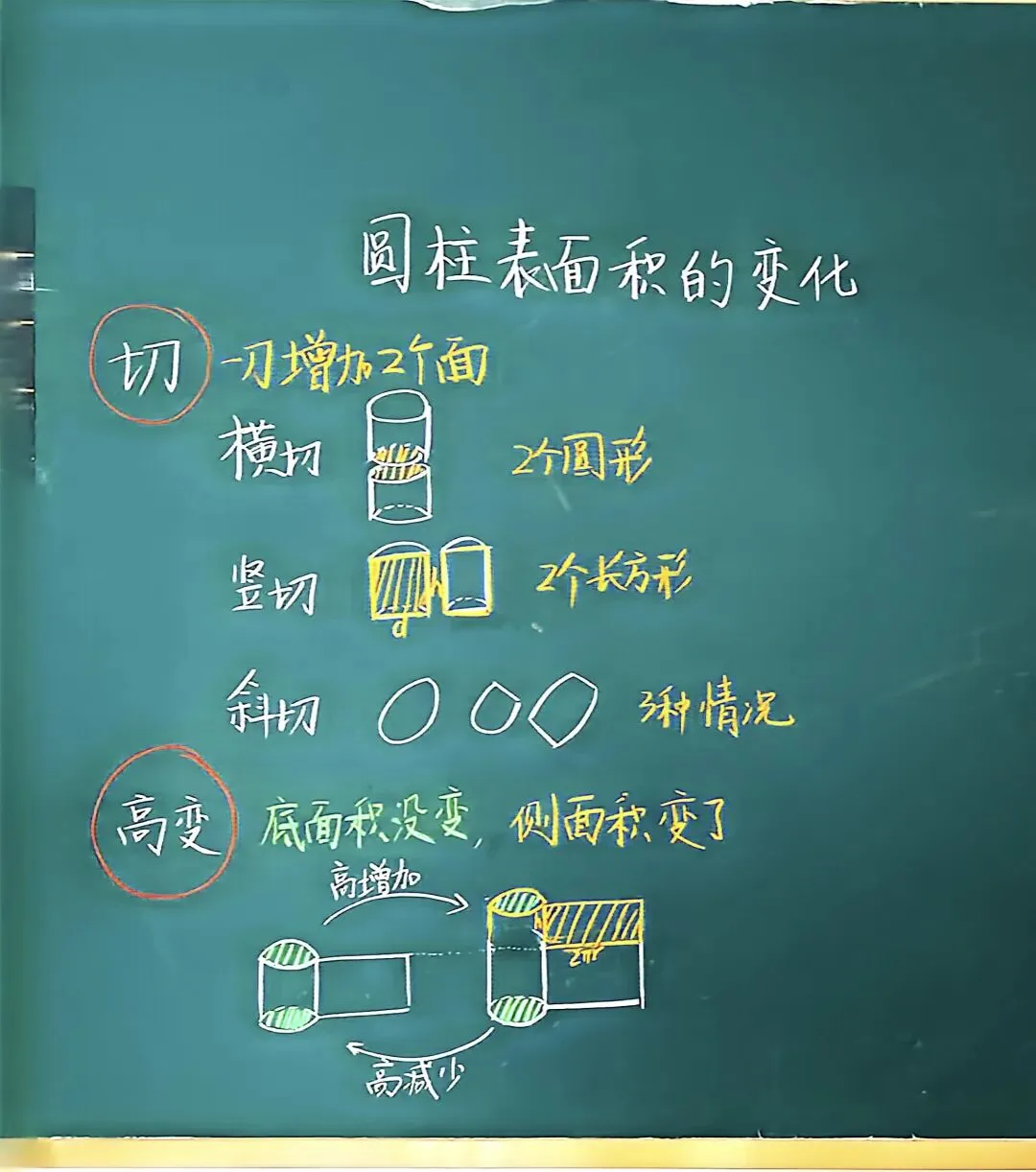 不得不说,对比青岛版教材,人教版教材可真好,好在哪里?细致从而深入。比如人教版教材把《圆柱表面积变化》单独作为例题讲解,还有对应的练习题,非常有针对性。而青岛版教材中根本没有把这个作为一个知识点单独拎出来,需要老师从一堆自主练习题中提取出来,练习册上也只有零散的几个练习题,也需要老师从中拎出来。这对于新教六年级的老师是非常不友好的,对于有研究精神的老师,也是耗费心神的。据说明年青岛版教材全面改版,不知道会不会改善这个问题。黄老师无私地分享了本节课的课件,我把希沃上的课件做成了普通课件,方便保存。文末有链接,需要的可以下载。提前让学生在家切一切圆柱体的香肠,可以准备五块,一块横着切,一块沿直径竖着切,其他三块斜着切。课堂上交流。总结:平行于底面横着切,会增加两个圆形;沿着直径垂直于底面竖着切,会增加两个长方形,而且长方形的长和宽就是圆柱的底面直径和高;斜着切,会有三种不同的情况。不管怎么切,有什么相同点?切一次增加两个面,切几次增加几×2个面。