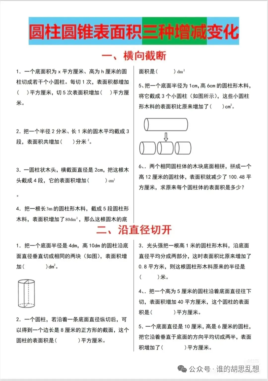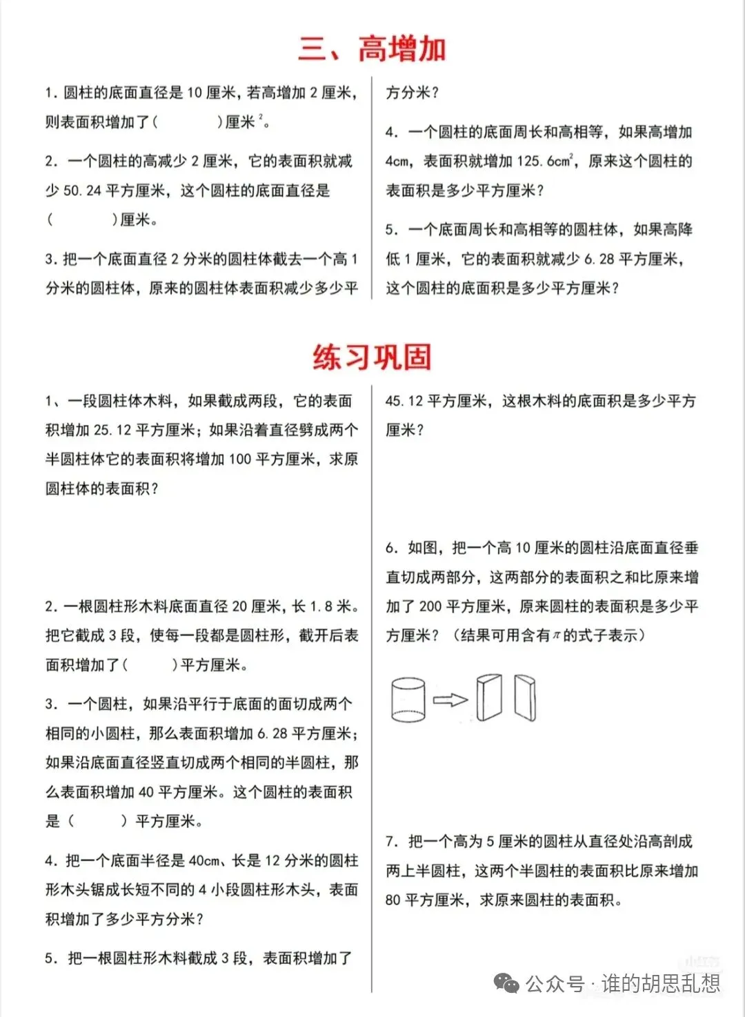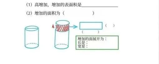 把一个底面直径是12厘米、高是10厘米的圆柱沿着直径切开,切开后的表面积增加了多少平方厘米?思考:如果一个圆柱的高增加h厘米,表面积增加多少?画图理解:高变化,底面积没变,侧面积增加,增加的侧面积=底面周长×h。一个圆柱的高减少2厘米,它的表面积就减少50.24平方厘米,这个圆柱的底面直径是( )厘米。把一个底面直径2分米的圆柱体截去一个高1分米的圆柱体,原来的圆柱体表面积减少( )平方分米。通过网盘分享的文件:2.2.2圆柱表面积的变化.pptx