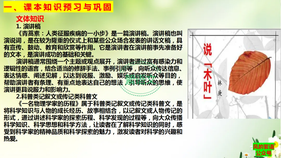 《青蒿素:人类征服疾病的一小步》是一篇演讲稿。演讲稿也叫演说词,是在较为隆重的仪式上和某些公众场合发表的讲话文稿,具有宣传、鼓动、教育和欣赏等作用。它是演讲者在演讲前事先准备好的文本,是演讲成功的基础和关键。