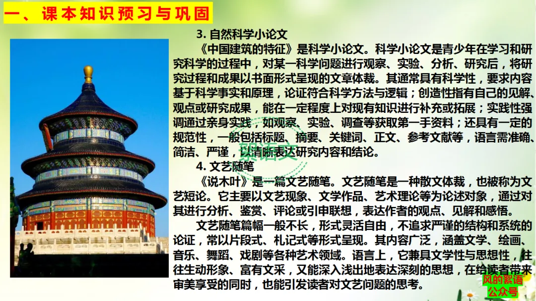《中国建筑的特征》是科学小论文。科学小论文是青少年在学习和研究科学的过程中,对某一科学问题进行观察、实验、分析、研究后,将研究过程和成果以书面形式呈现的文章体裁。其通常具有科学性,要求内容基于科学事实和原理,论证符合科学方法与逻辑;创造性指有自己的见解、观点或研究成果,能在一定程度上对现有知识进行补充或拓展;实践性强调通过亲身实践,如观察、实验、调查等获取第一手资料;还具有一定的规范性,一般包括标题、摘要、关键词、正文、参考文献等,语言需准确、简洁、严谨,以清晰表达研究内容和结论。