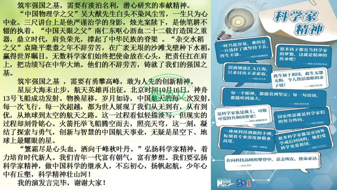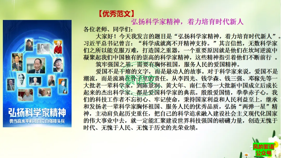 大家好!今天我发言的题目是“弘扬科学家精神,着力培育时代新人”。习近平总书记曾言:“科学成就离不开精神支持。”其言信然,无数科学家们之所以能克服万难,打造国之重器,一个重要原因就是他们在坎坷逆流中凝聚起我们中国独有的崇高的科学家精神,这些精神指引着他们不断前行 。