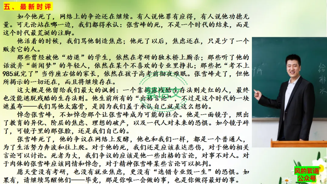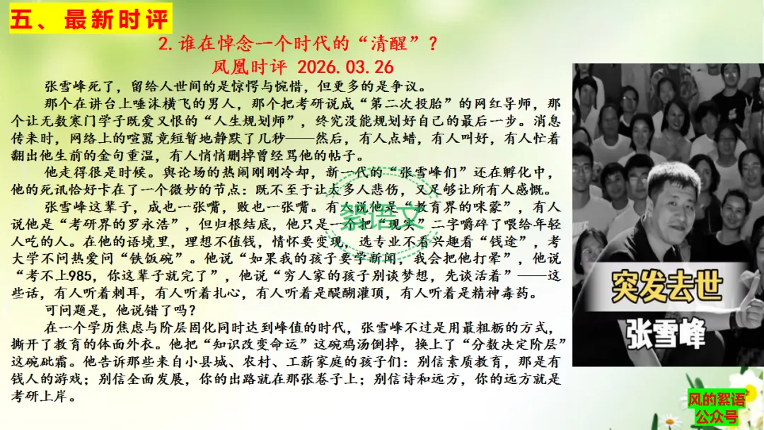 如今他死了,网络上的争论还在继续。有人说他罪有应得,有人说他功德无量。可无论站在哪一边,我们都得承认:张雪峰的死,不是一个时代的结束,而是这个时代最荒诞的注脚。