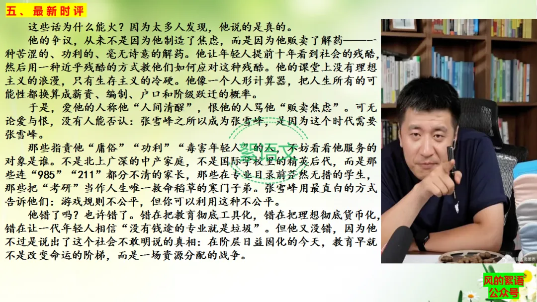 在一个学历焦虑与阶层固化同时达到峰值的时代,张雪峰不过是用最粗粝的方式,撕开了教育的体面外衣。他把“知识改变命运”这碗鸡汤倒掉,换上了“分数决定阶层”这碗砒霜。他告诉那些来自小县城、农村、工薪家庭的孩子们:别信素质教育,那是有钱人的游戏;别信全面发展,你的出路就在那张卷子上;别信诗和远方,你的远方就是考研上岸。