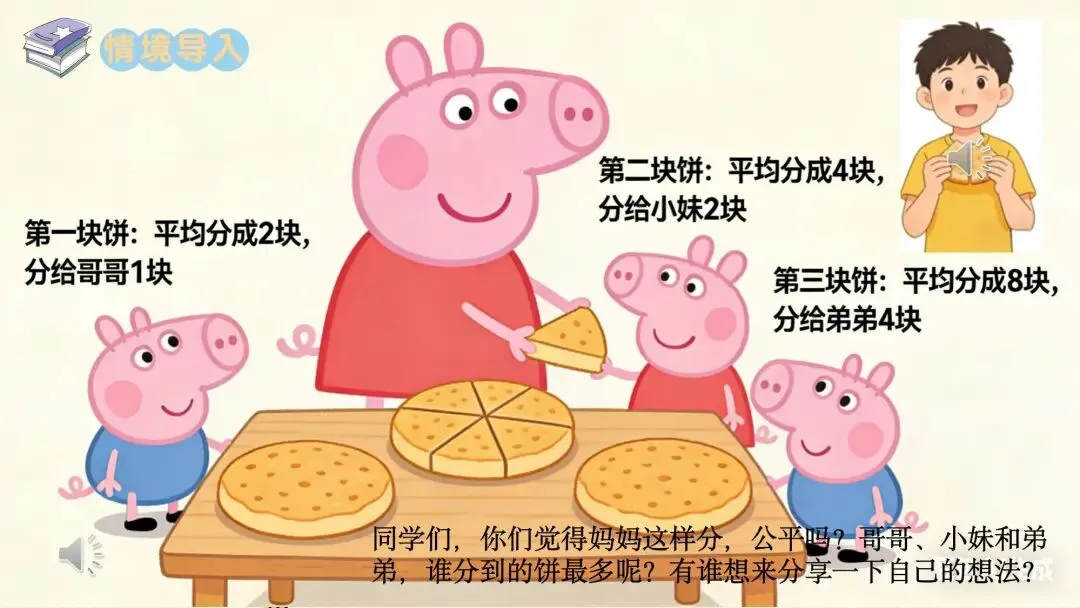 同学们,你们觉得妈妈这样分,公平吗?哥哥、小妹和弟弟,谁分到的饼最多呢?有谁想来分享一下自己的想法?
