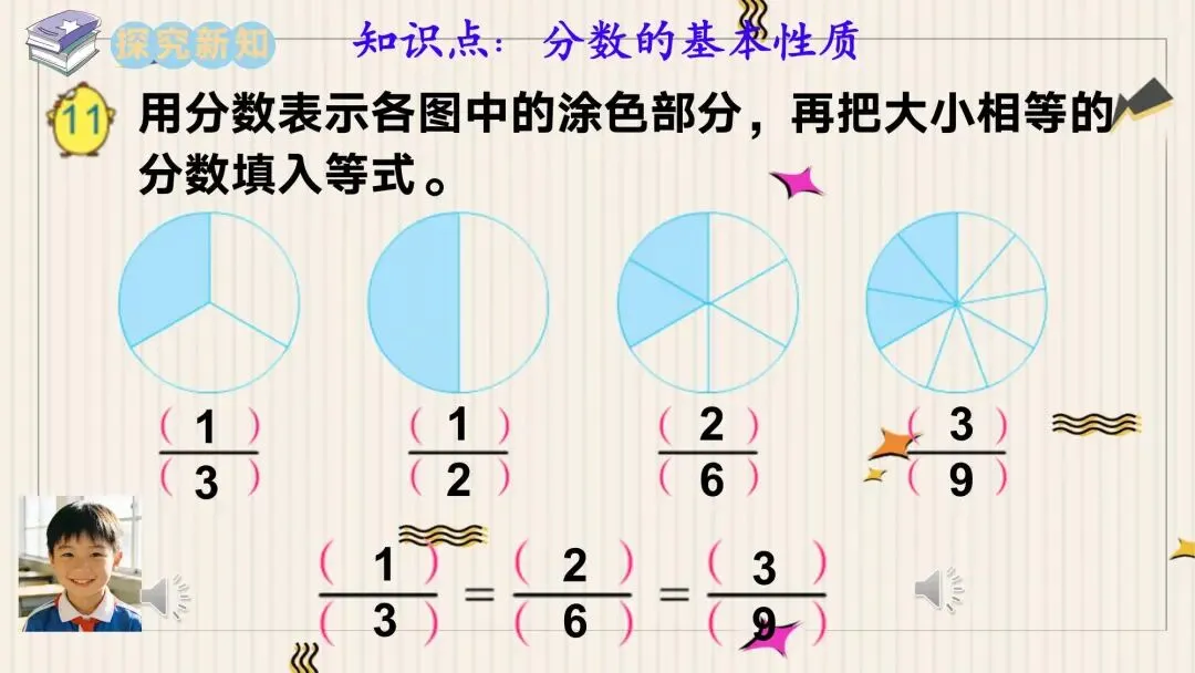 教师: 同学们,大家好!欢迎来到今天的数学微课堂。今天,我们要一起探索分数世界里一个非常重要的性质——分数的基本性质。