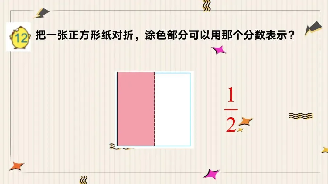 (切换至折纸探究第一页:把一张正方形纸对折,涂色表示它的1/2)