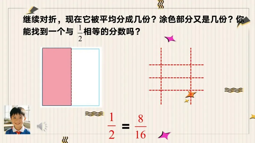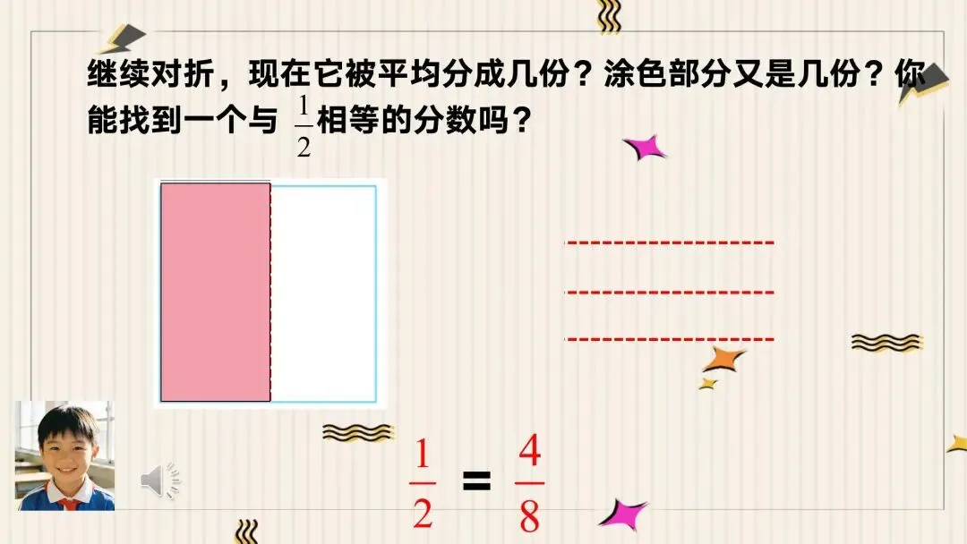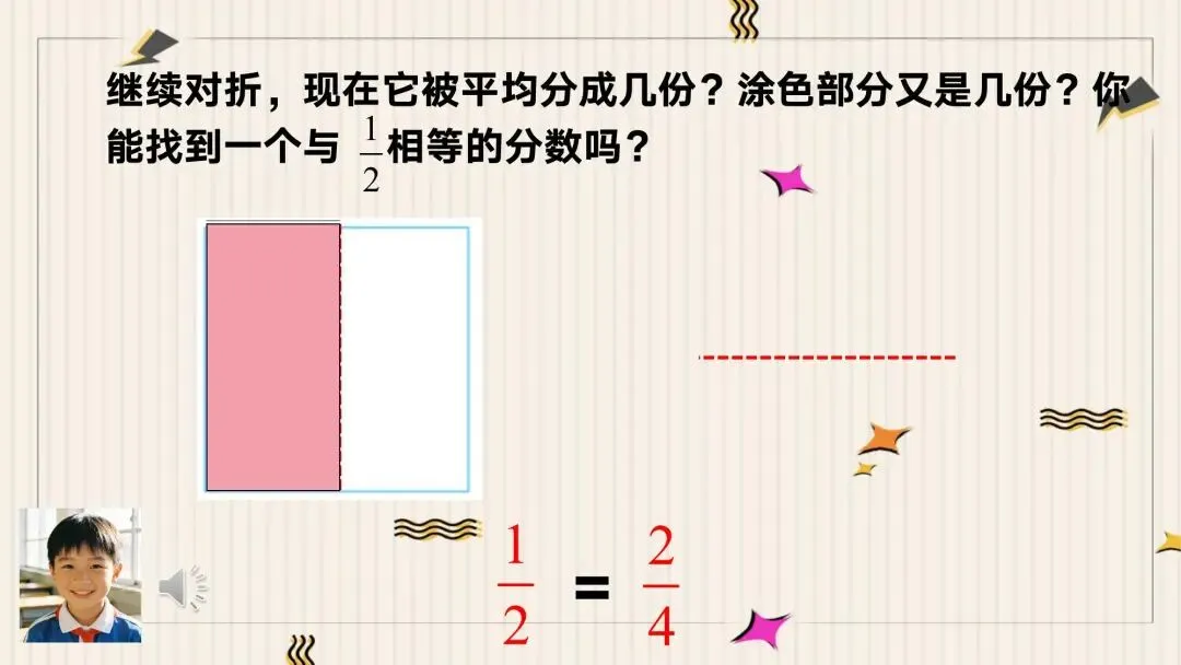 教师: 对,是1/2。现在,我们把它继续对折。看,现在它被平均分成了几份?涂色部分又是几份?你能找到一个和1/2相等的分数吗?