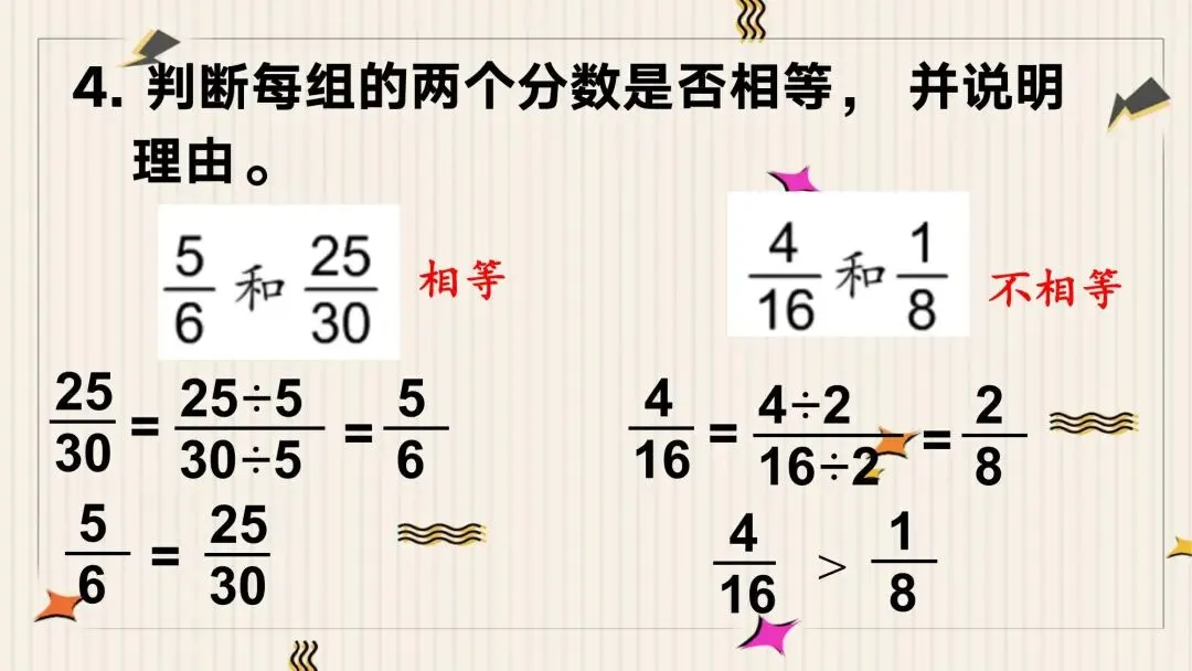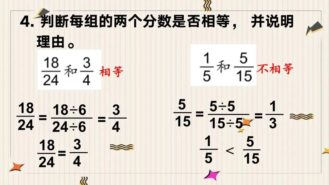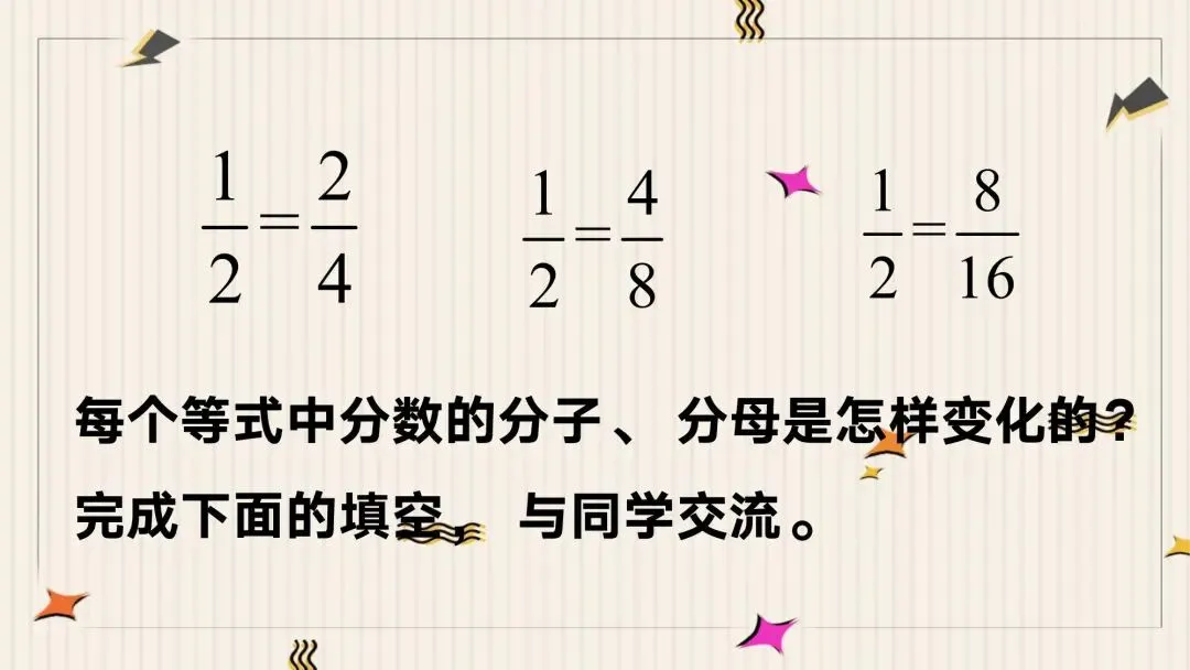 教师: 说得真好!你不仅用分数准确地表示了每个人分到的部分,还通过生活经验进行了合理的推测。但数学是一门严谨的学科,我们不能仅仅停留在“感觉”上。这三个分数之间,到底有没有相等的关系呢?它们背后又藏着什么规律?让我们带着这些问题,开始今天的探究之旅。