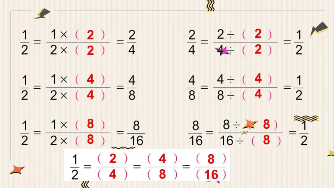 教师: 我们用同样的方法来分析第二个等式,1/2 = 4/8。从左到右,分子分母同时乘了4。反过来,同时除以4。第三个等式,1/2 = 8/16,分子分母同时乘了8,反过来同时除以8。