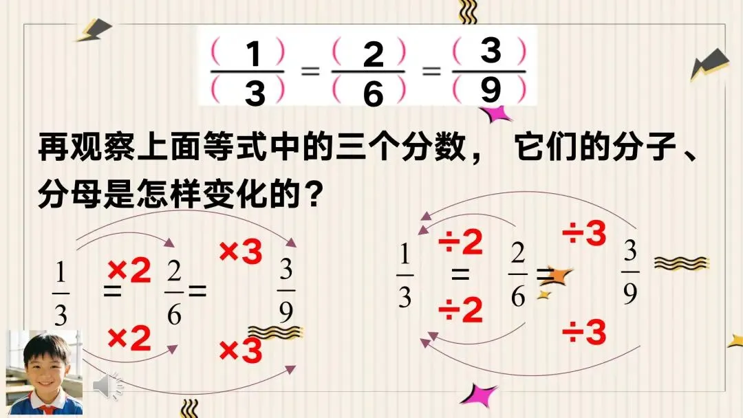 教师: 回到我们最开始得到的等式,1/3 = 2/6 = 3/9。谁能说一说,这组等式中,分子和分母又是按照什么规律在变化?