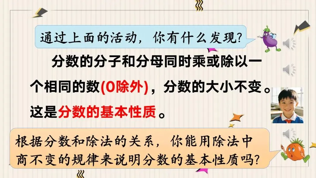 教师: 没错!所以,我们完整的结论是:分数的分子和分母同时乘或除以一个相同的数(0除外),分数的大小不变。这就是分数的基本性质。 请大家一起响亮地读一遍。
