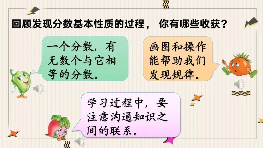 教师: 回顾我们刚才发现分数基本性质的过程,你有哪些收获呢?屏幕上也给了我们一些提示。比如,我们发现,一个分数,可以有无数个与它相等的分数。我们还体会到,画图和操作能帮助我们非常直观地发现规律。更重要的是,我们要注意沟通知识之间的联系,就像刚才用除法的知识来理解分数一样。