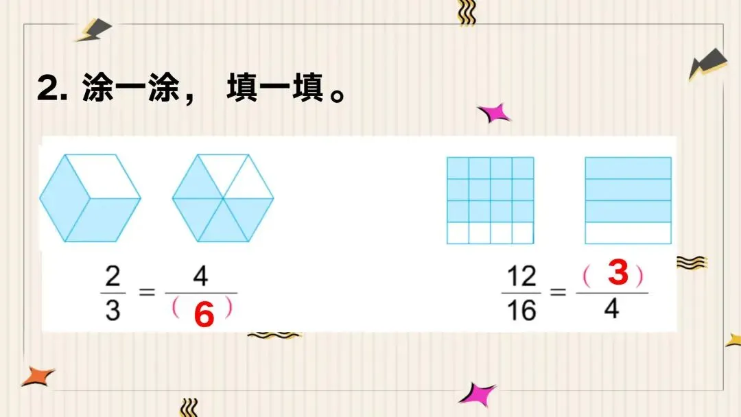 教师: 完全正确!现在,请大家当一回“火眼金睛”,在这些分数中,找一找哪些分数所表示的涂色部分大小是完全相等的?并试着把它们填入下面的等式。